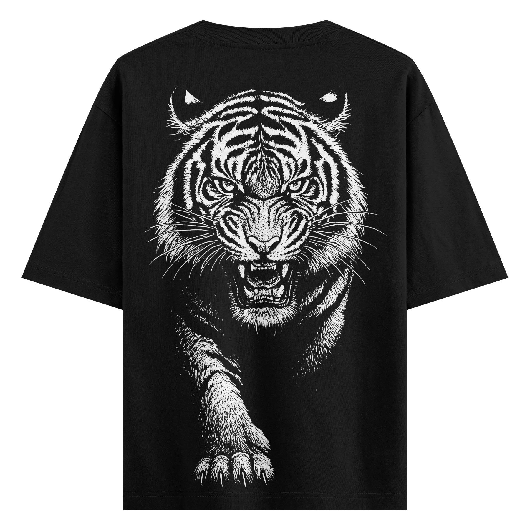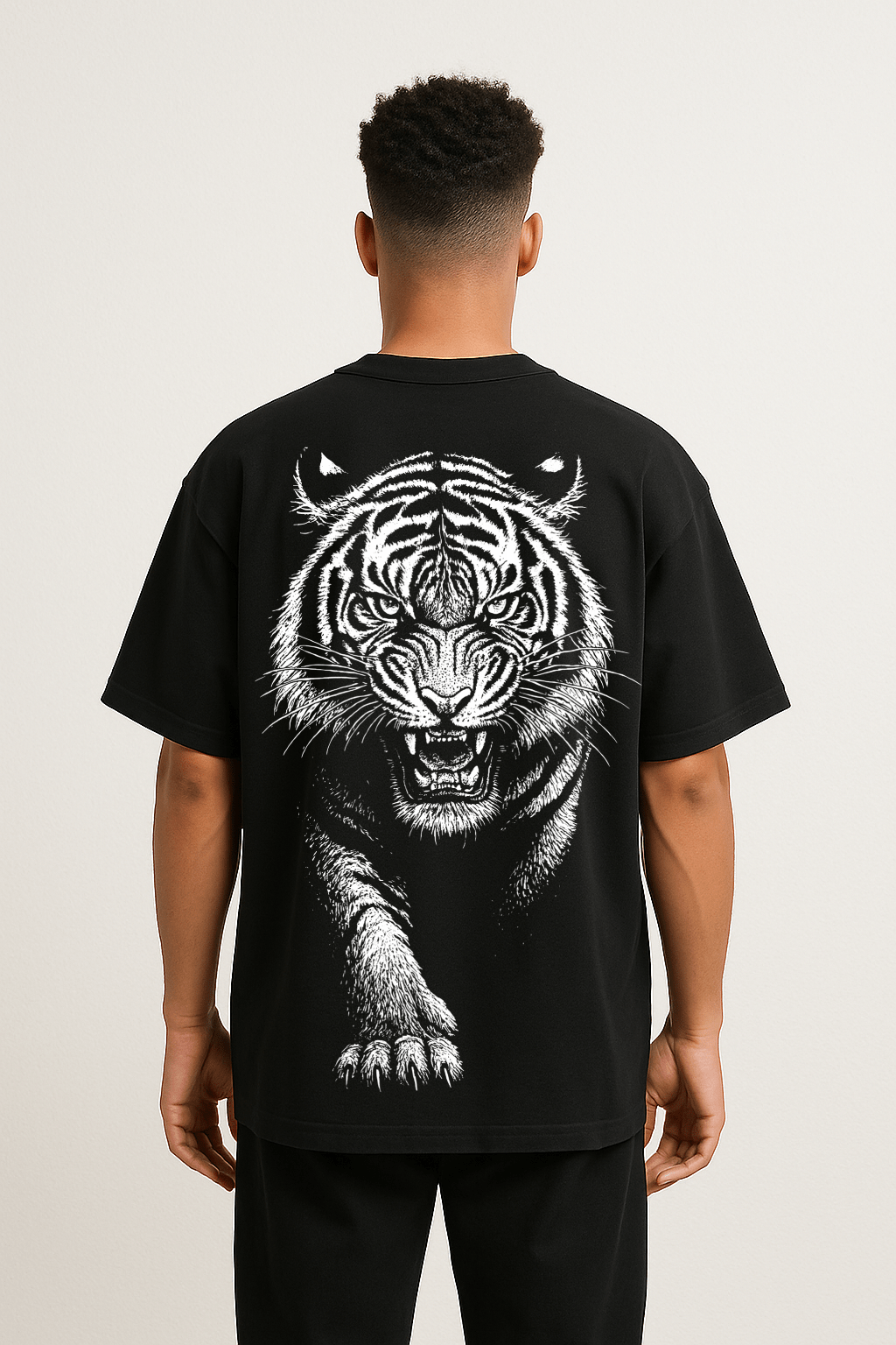 Unleash your wild side with this striking oversized black t-shirt featuring a fierce, roaring tiger graphic. Designed for streetwear enthusiasts who love powerful animal prints and bold statement pieces.