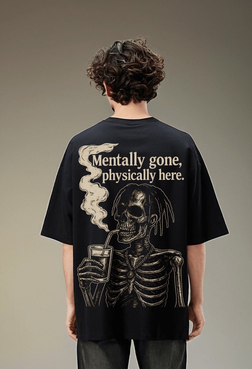 Shop this bold oversized black t-shirt featuring an edgy skeleton sipping a drink with the quote “Mentally gone, physically here.” Perfect for streetwear lovers who enjoy dark humor and standout graphics.