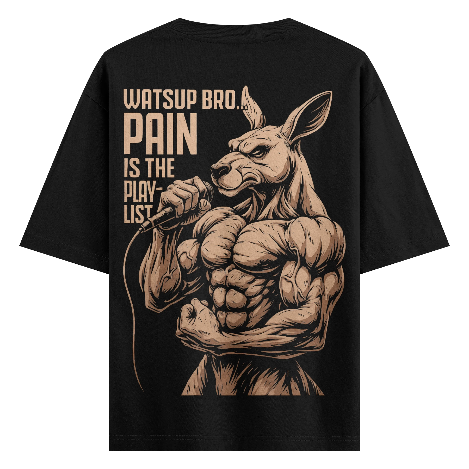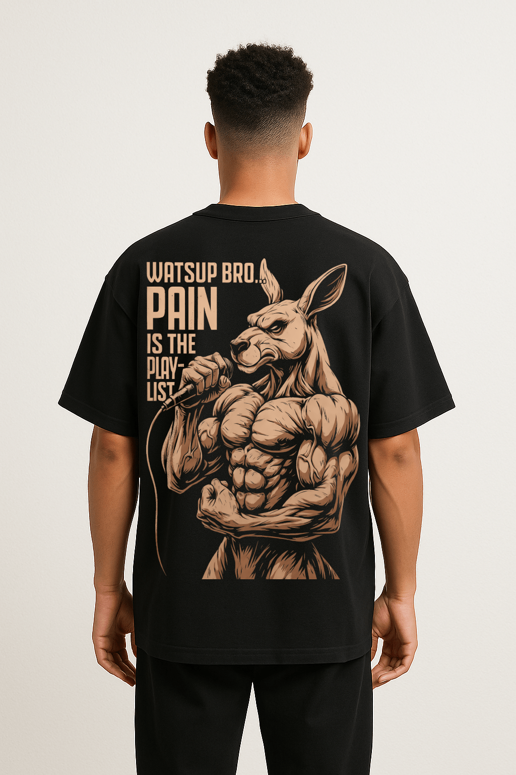 Crush every workout with the fierce kangaroo “Pain is the Playlist” tee. A streetwear beast made for gym bros who train hard and loud. Oversized, premium fit only at AiryTrend.in.